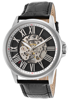 An exemplary profile in time from the new Lucien Piccard Calypso collection. Timeless traditional men's automatic watch offers a highly distinguished profile for today's man with a generous 45mm case, highly polished to a lustrous glow. The case is presented on a handsome crocodile-embossed leather strap. The skeleton center dial and caseback let you view the intricate automatic movement inside. Luminous sword hands and raised Roman numeral hour markers on the outer dial add to the classic appeal.